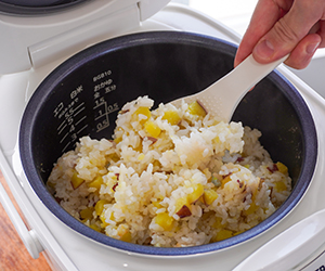 定番のさつまいもごはんに相性のよいバターをまとわせて食欲をそそる味わいにします。お好みでごま塩をふりかけてお召しあがりください。