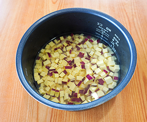 2米はよく洗い、炊飯器に米とAの水、調味料を加えてよく混ぜ合わせ、上にさつまいもをのせてスイッチを入れる(時間があれば15~30分ほど浸水させる)。