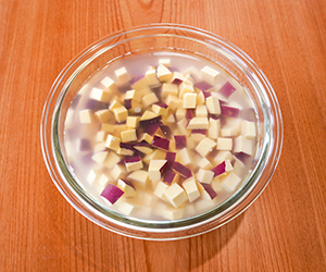 1さつまいもは皮つきのまま1cm角に切り、大きめのボウルに水をはって水にさらす。水けを切る。