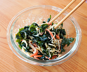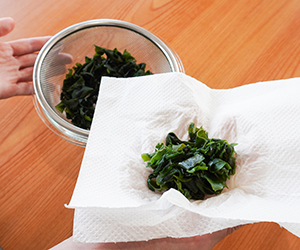 1乾燥わかめはボウルに入れ、たっぷりの水で戻す。ザルにあげ、ペーパータオルでしっかり水けを切る。